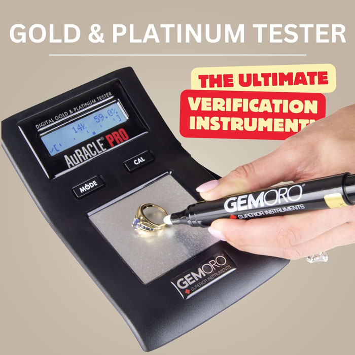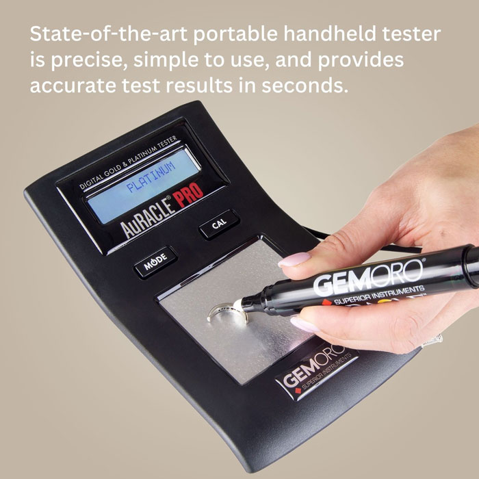 GEMORO’s advanced digital AuRACLE PRO is the ultimate verification instrument for gold and platinum testing. This state-of-the-art portable handheld tester has exceptional precision, is simple to use, and in only seconds provides accurate test results—PATENTED