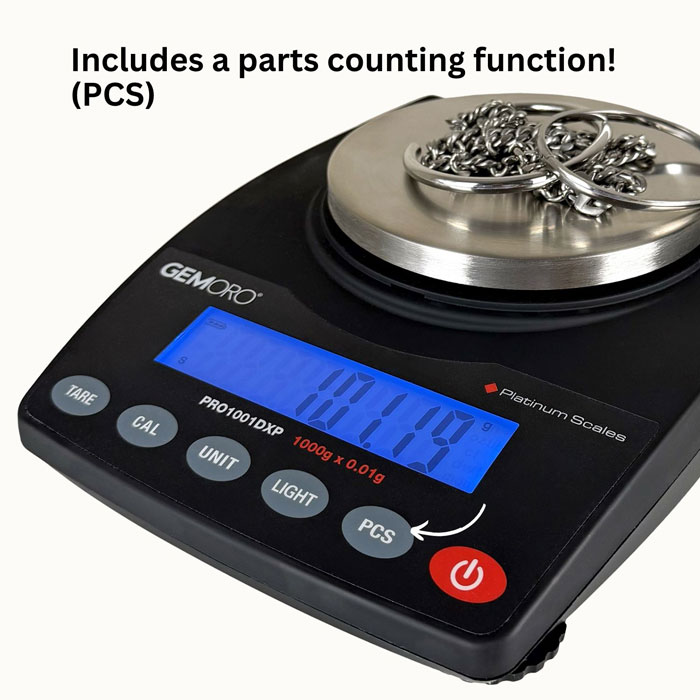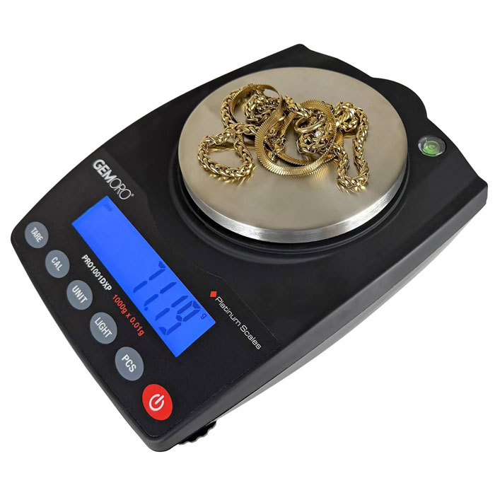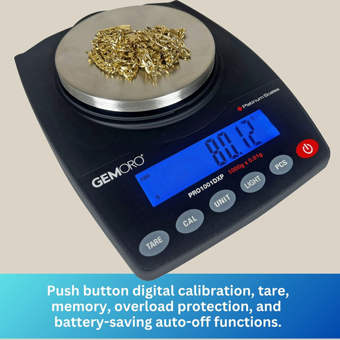 GEMORO has created the ultimate top-of-the-line countertop / portable scale for professional jewelers, findings dealers, precious metals scrap buyers, and gold wholesalers who demand the best. The deluxe Platinum PRO1001DXP offers amazing extra precision, higher capacity, and enhanced features previously only found in European balances that cost well over $1000. Unmatched performance and durability, low profile contoured design, rock-solid stability, extended warranty, and more – all at a real value of a price. It’s no wonder that GEMORO is the leader in precision weighing for the jewelry industry!