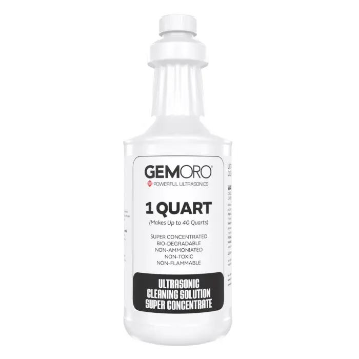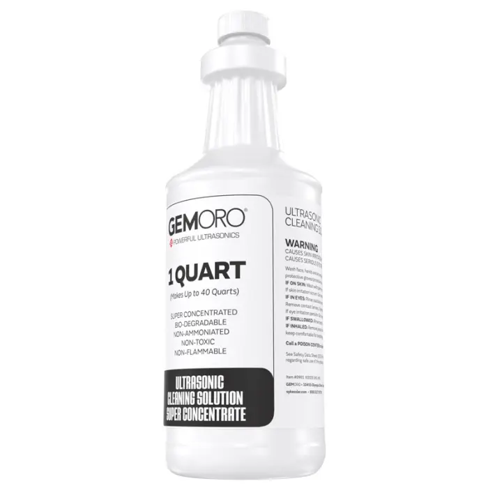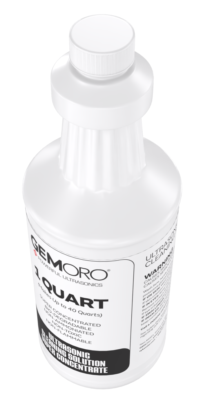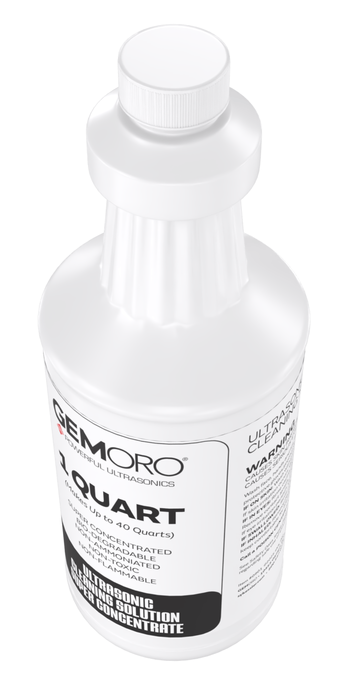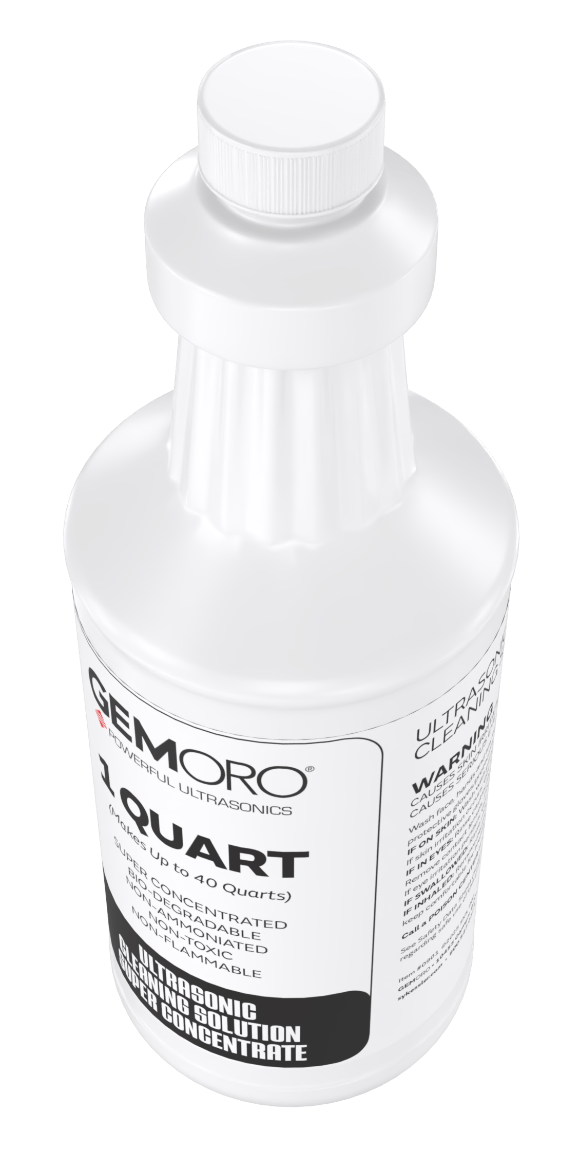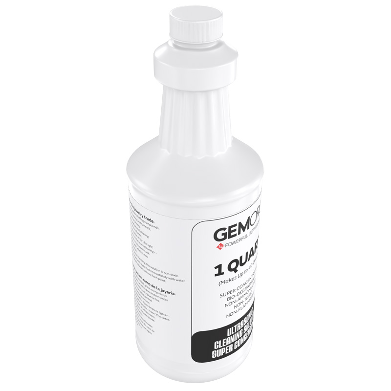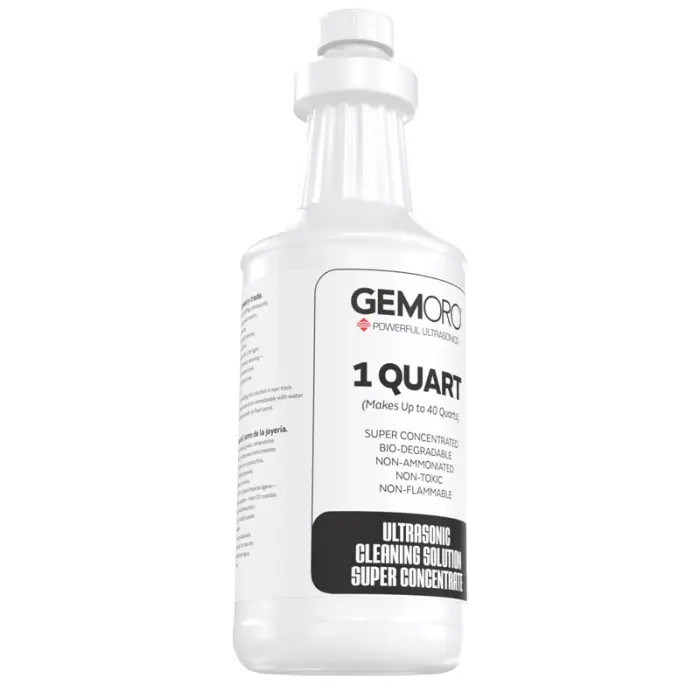 To obtain the best general cleaning results out of your ultrasonic, we have the solution: GEMORO Ultrasonic Cleaning Solution! Economical to use, it dilutes 40 to 1 for light cleaning, 20 to 1 for heavy cleaning. Our solution is recommended for removing dirt, grease, buffing compounds, rouge, tripoli and oxides. Also used for cleaning instruments, burs, metal parts, gold and fine jewelry. GEMORO Super Concentrated Cleaning Solution is great for ultrasonics, glass and general cleaning. Non-ammoniated, no color additives, super concentrated, biodegradable, non-toxic and non-flammable. Instructions for use are imprinted on each bottle in both English and Spanish.