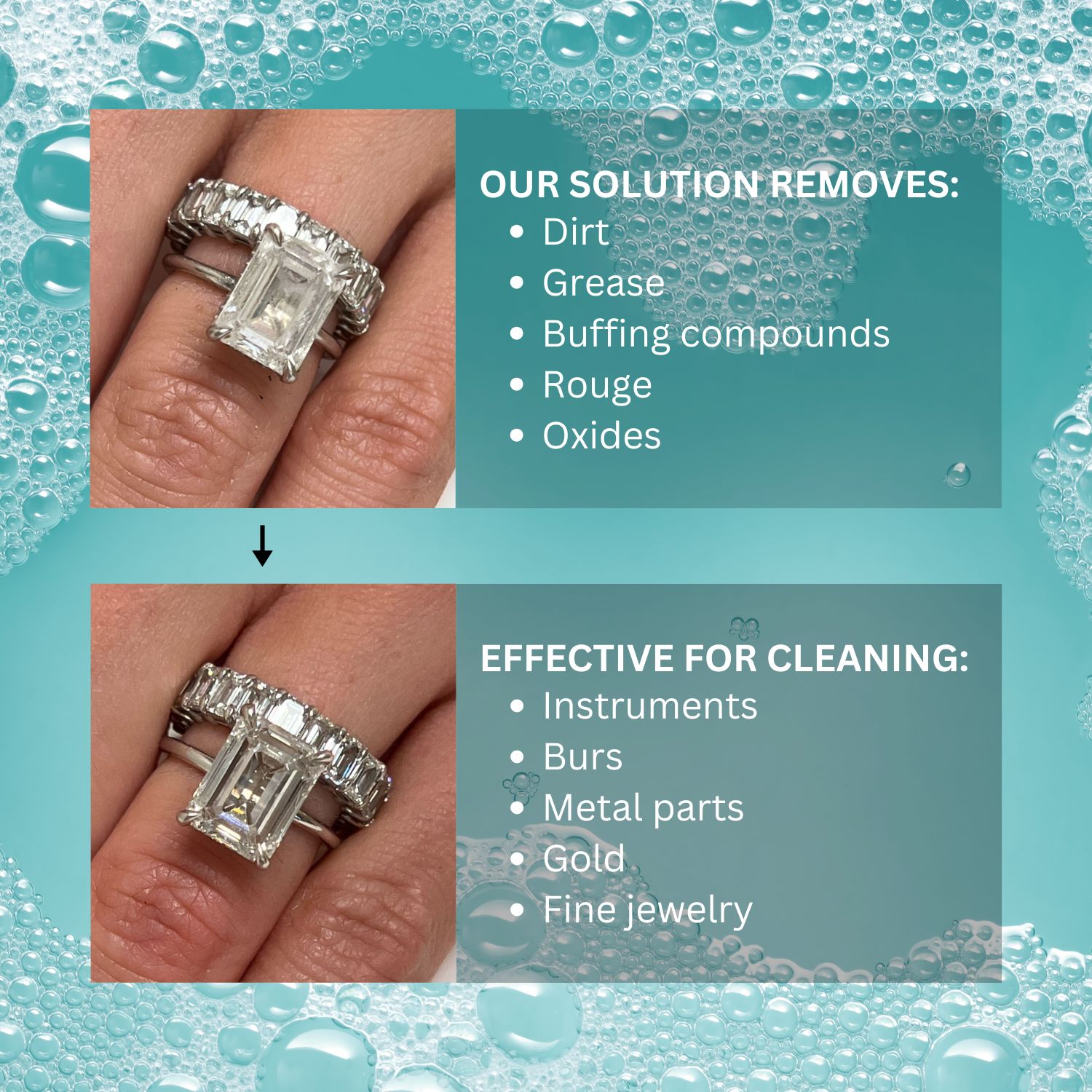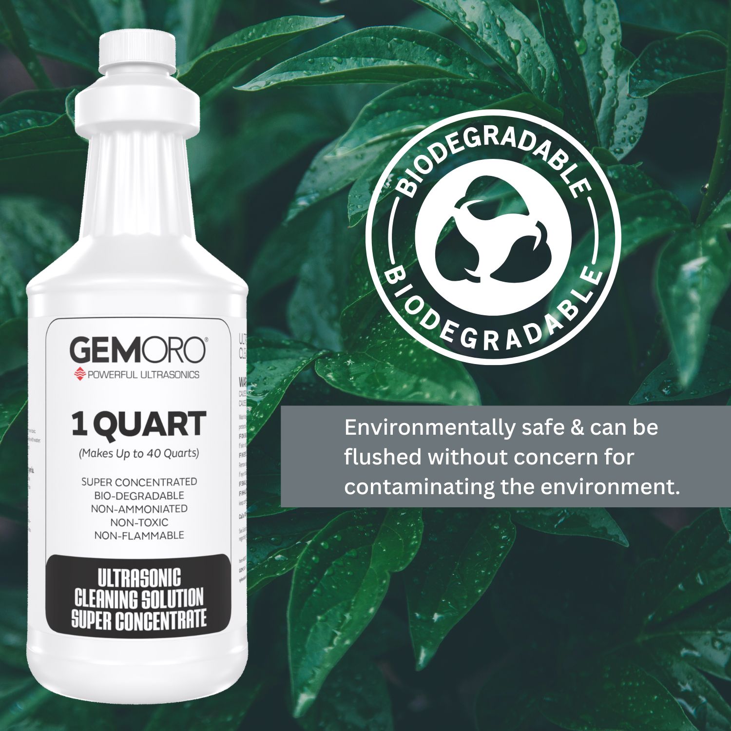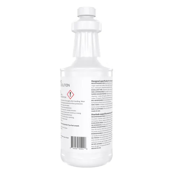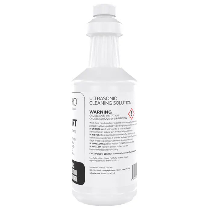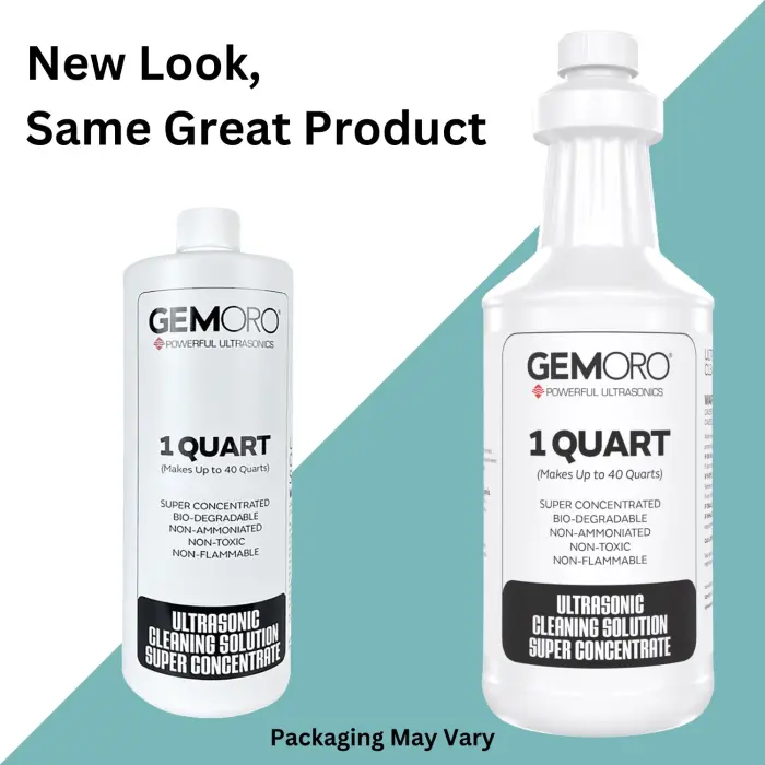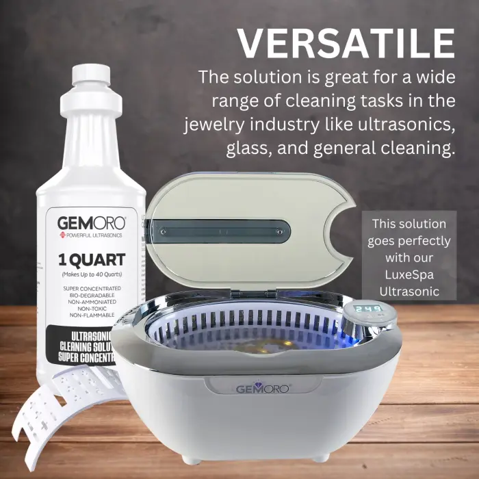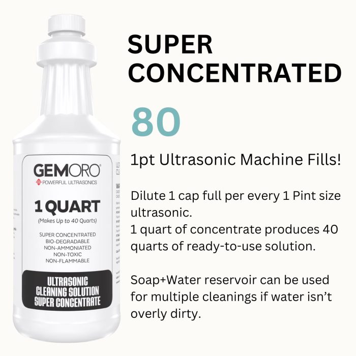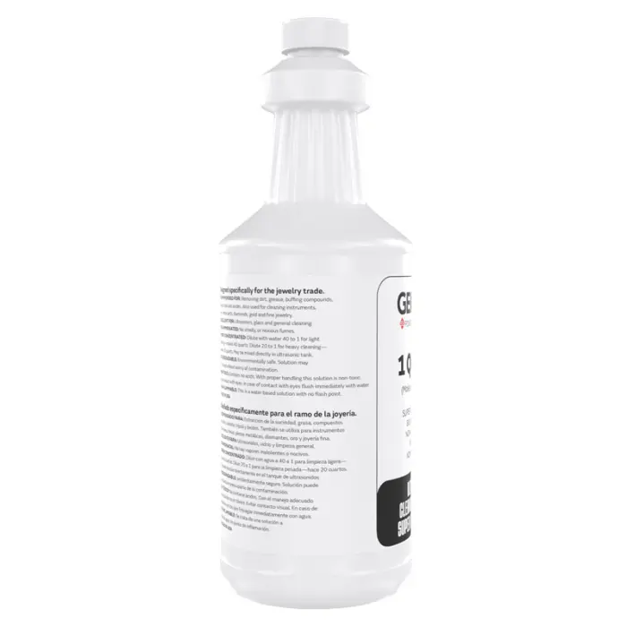 To obtain the best general cleaning results out of your ultrasonic, we have the solution: GEMORO Ultrasonic Cleaning Solution! Economical to use, it dilutes 40 to 1 for light cleaning, 20 to 1 for heavy cleaning. Our solution is recommended for removing dirt, grease, buffing compounds, rouge, tripoli and oxides. Also used for cleaning instruments, burs, metal parts, gold and fine jewelry. GEMORO Super Concentrated Cleaning Solution is great for ultrasonics, glass and general cleaning. Non-ammoniated, no color additives, super concentrated, biodegradable, non-toxic and non-flammable. Instructions for use are imprinted on each bottle in both English and Spanish.
