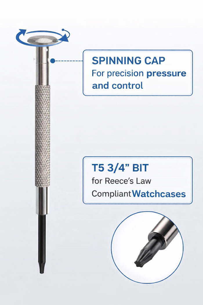 - The T5 3/4″ bit is specifically suited for Reece’s Law–compliant watchcases, ensuring safe, secure, and regulation-aligned battery access.